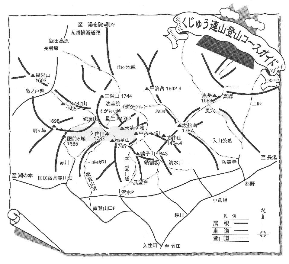 竹田⇒車で30分⇒ 久住⇒車で10分⇒ 南登山口⇒徒歩で15分⇒ 取付け⇒徒歩で40分⇒ 猪鹿狼跡寺⇒徒歩で120分⇒ 神明水⇒徒歩で15分⇒ 久住山頂⇒徒歩で40分⇒ 中岳⇒徒歩で30分⇒ 稲星山⇒徒歩で10分⇒ 稲星越⇒徒歩で100分⇒ 沢水キャンプ場⇒車で15分⇒ 久住⇒車で30分⇒ 竹田| 区間 |